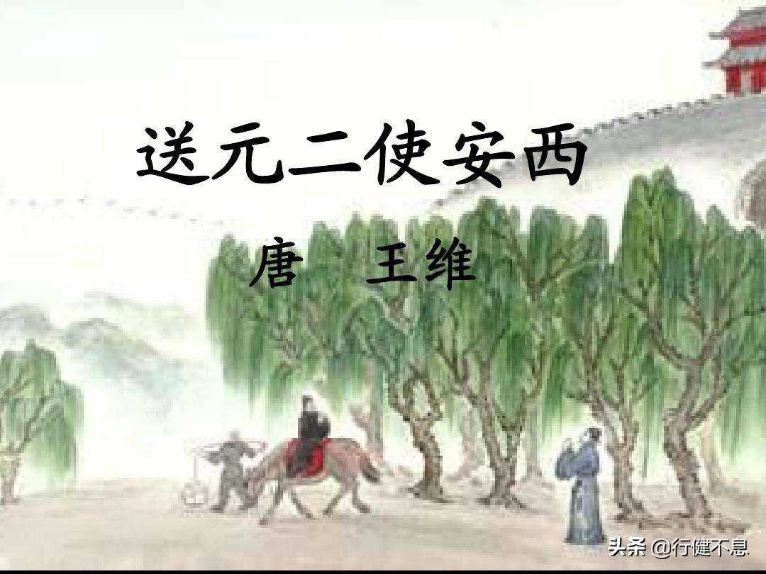 元二,姓元,名字不详,排行第二,是王维的朋友。他要出使安西(唐代安西都护府,治所在龟兹城,今天的新疆库车市)。王维在渭城(今陕西咸阳)的驿馆折柳(折柳,是古代送行习俗,柳者,谐音留也。)为他送行,作了这首诗相赠。