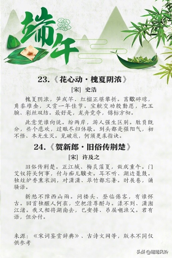 16、旧俗传荆楚。正江城、梅炎藻夏,做成重午。——许及之《贺新郎》
