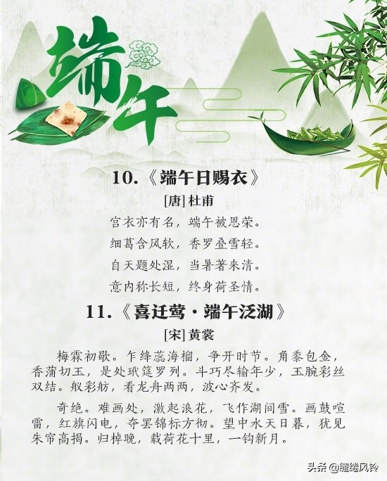 15、粽团桃柳,盈门共饮,把菖蒲、旋刻个人人。——秦观《端午》