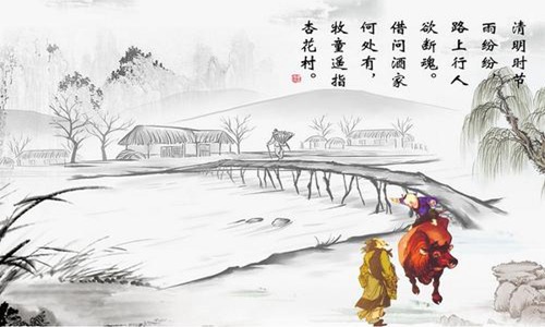最后的一句的“牧童遥指杏花村”就说明了诗人的问路对象,小牧童的热心声音和远处杏花盛开的景象这副生动的画面就与前面的消愁相映对比,带来了一副凄迷感伤的画面。