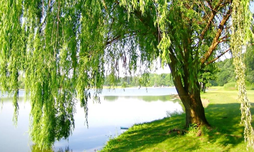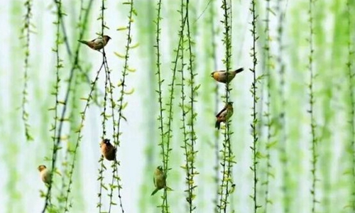 早春的柳树发出嫩绿的新芽,如同一位婀娜美人,垂下来的万缕垂丝好像是绿色的裙带。