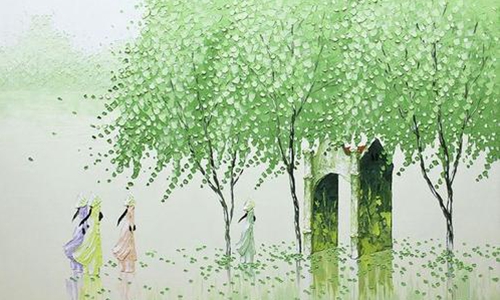 第二句是写枝。“丝绦”是用丝编织的带子。这是写柔条垂拂的繁茂,写柳的风姿。柔长的枝条千枝万缕,春风吹拂,体态轻盈,宛如妙龄女子翩翩起舞。姿态非常动人。“万条垂下”的“绿丝绦” 不正像碧玉小家女穿的百褶裙吗?
