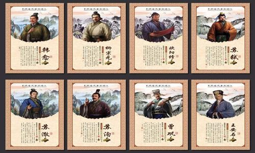其中韩愈、柳宗元是唐代古文运动的领袖,欧阳修、三苏等四人是宋代古文运动的核心人物,王安石、曾巩是临川文学的代表人物。他们先后掀起的古文革新浪潮,使诗文发展的陈旧面貌焕然一新。