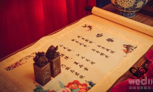 2、合卺报喜有金鸡,熊罴梦占雀声啼,赤绳系脚良缘定,风烛登科金榜题;红抽添香堪佐读,白首齐眉乐倩兮,琴瑟和鸣鸳鸯配,绵绵瓜瓞步云梯。