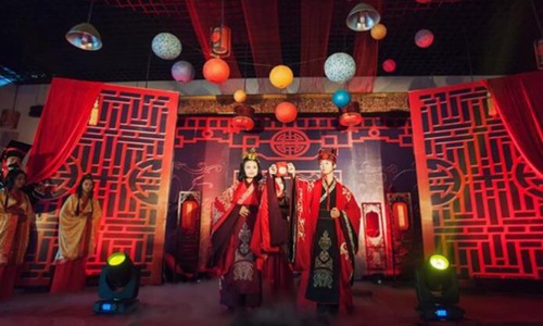 7、红毹拥出态娇妍,璧合珠联看并肩,福慧人间君占尽,鸳鸯修到傲神仙。