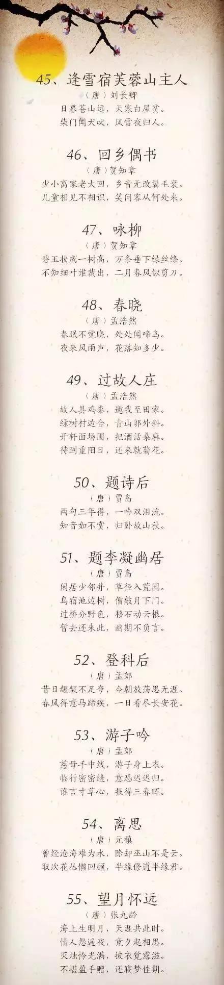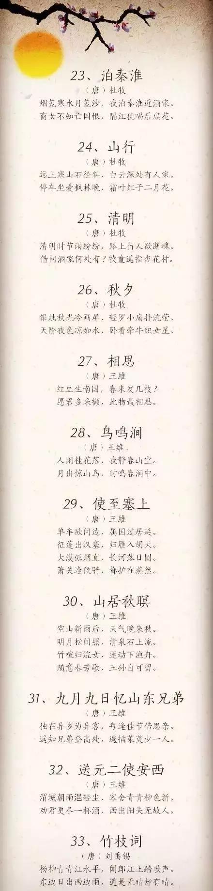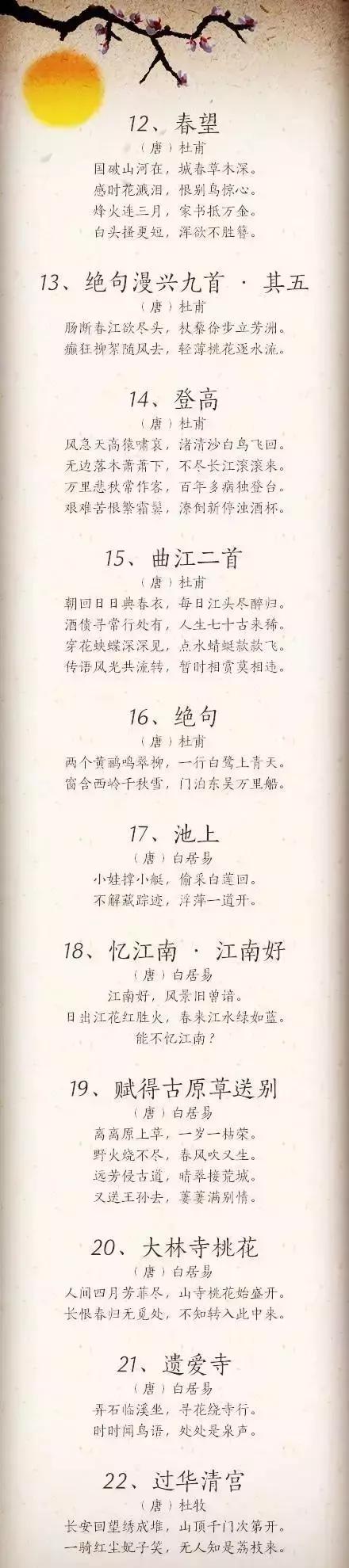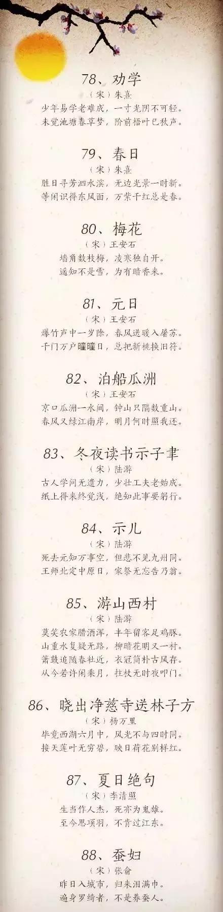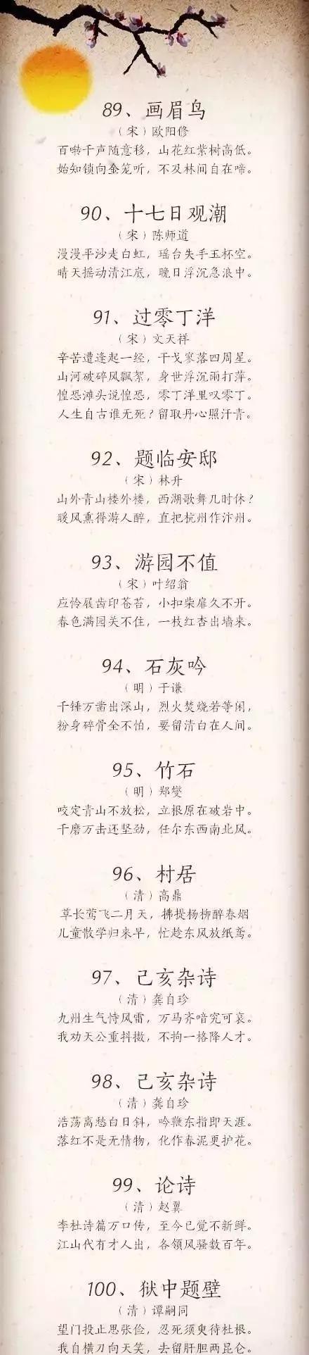 导语:精选小学必背古诗,81首呈现!小学生必背古诗81首:81示儿 (南宋 陆游)82春望 (唐 杜甫)83闻官军收河南河北 (唐 杜甫)84过零丁洋 (南宋 文天祥)85乐游原 (唐 李商隐)86题西林壁 (北宋 苏轼)87登飞来峰(北宋 王安石)88望岳 (唐 杜甫) (苏教版/第10册89游山西村 (南宋 陆游)90题都城南庄 (唐 崔护)91冬夜读书示子聿(yu) (南宋 陆游)(苏教版/第11册)92观书有感 (南宋 朱熹) (苏教版/第11册)93 出塞 (唐 王昌龄)(苏教版/第11册)